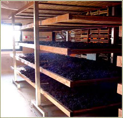 Le uve, sane e perfettamente mature non solo sulla buccia ma anche internamente, sono selezionate già al momento della raccolta, nelle prime due settimane di ottobre, scegliendo i grappoli spargoli, con gli acini non troppo vicini tra loro, in modo che lascino circolare l’aria. Queste piccole “pepite” scure sono distribuite sui plateaux, ampie cassette di legno, sempre più spesso sostituite da plastica traforata, per l’aerazione e per garantire una più rapida lavabilità dopo l’uso.